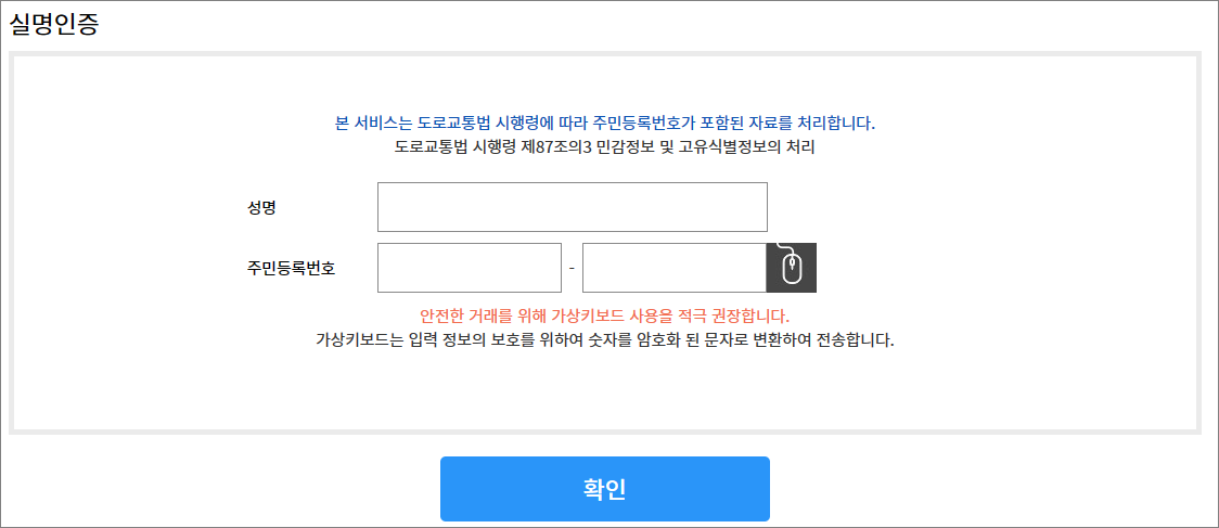 그 다음 실명인증 확인 정보 입력 후 확인버튼 클릭