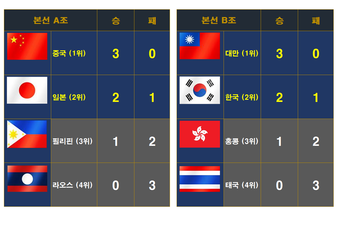 4개국가씩 A, B 2개조로 나누어 풀리그를 치릅니다.