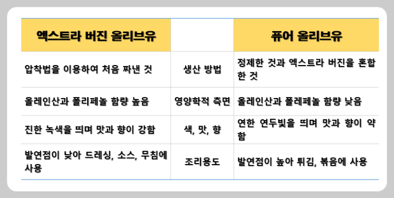 엑스트라 버진 은 샐러드나 드레싱에 적합하고, 퓨어 올리브유는 튀김이나 볶음용으로 적합합니다.
