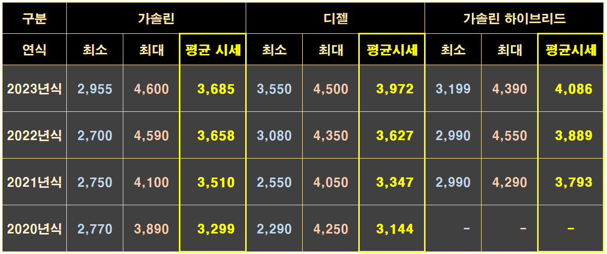 가솔린은 연식의 의미가 크게 없네요. 1년 된 차량과 3년 된 차량의 평균시세는 300만원 정도밖에 안 합니다.