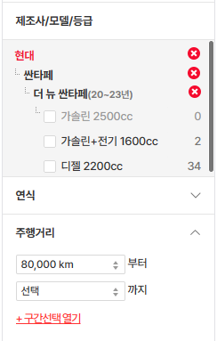 결과가 좀 의심스러워 엔카에서 다시 확인해 보았는데 더 뉴 싼타페는 8만Km 이상 주행한 매물이 현재 없는 것으로 확인이 되었습니다. 시간이 지나면 나오긴 하겠죠.