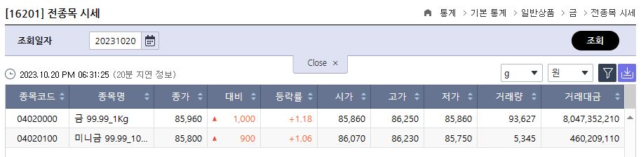 우선 한국 거래소에서는 환율을 포함, 금 시세도 제공하고 있습니다.