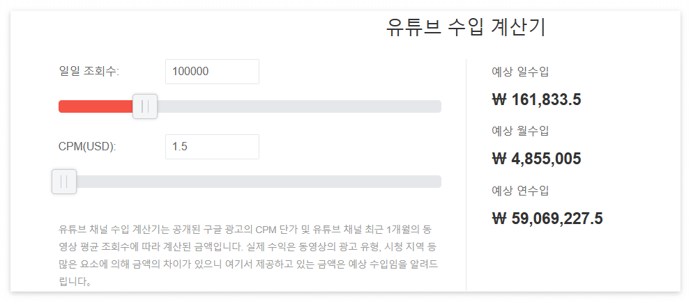 여기 중간에 일일 조회수를 입력하면 오른쪽에 예상 일, 월, 연 수입이 자동으로 계산됩니다.