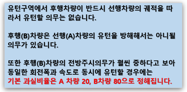 그러나 앞차와 뒤차가 비슷한 회전 반경과 속도로 동시에 유턴하다가 충돌했다면 A차량도 20% 과실이 있다는 점 유의해야 합니다.