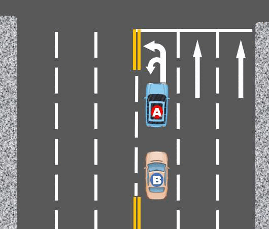 A차량과 B차량은 유턴을 하기 위해 맨 왼쪽 유턴 차선에서 대기하고 있었습니다.