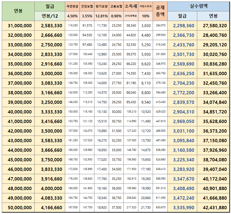 많이 버는 만큼 소득세, 건강보험, 국민연금 이것저것 공제하는 것이 많은데 연봉별로 월급은 얼마고 실수령액은 얼마인지 알아보겠습니다.