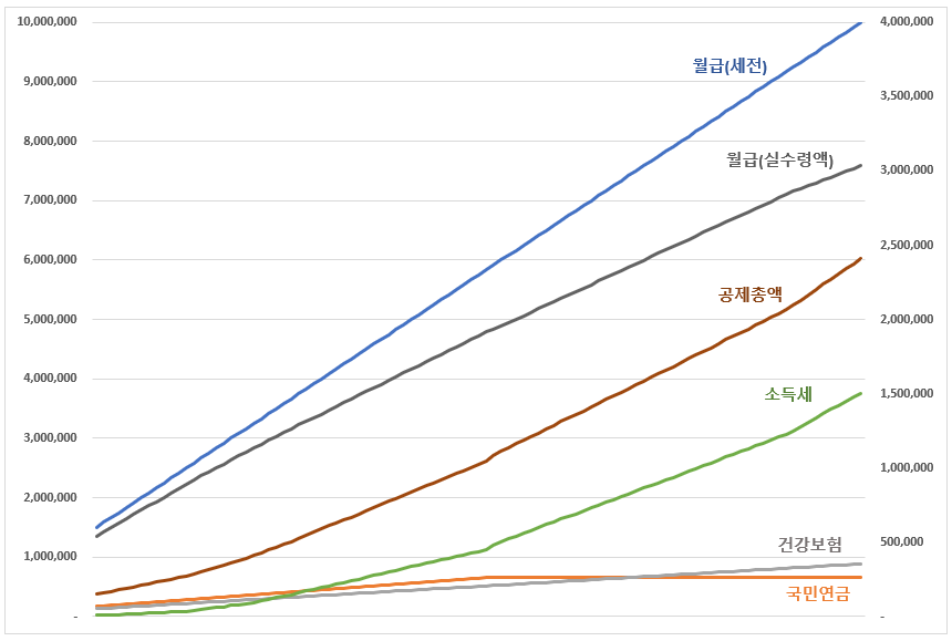 월급이 쭉 올라가는 기울기와 실수령 월급의 기울기는 점점 벌어집니다.