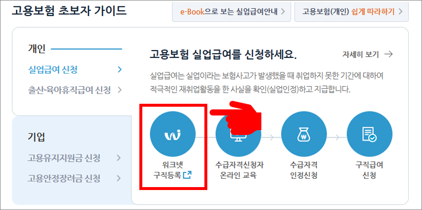 또, 실업급여를 신청하려면 워크넷에 가서 구직등록을 해야 합니다.