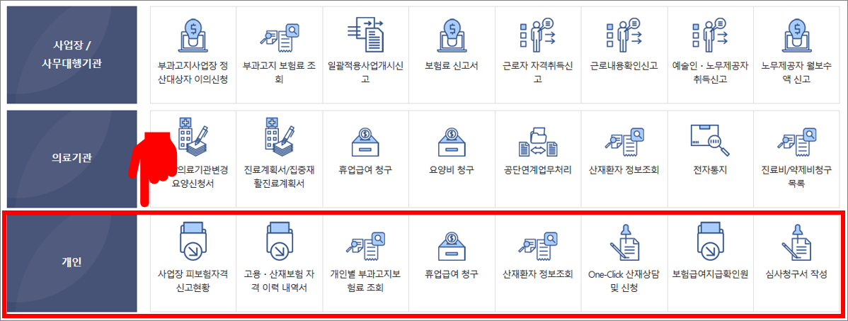 고용산재보험 토탈서비스에서는 사업장과 의료기관, 개인을 대상으로 서비스를 합니다.
