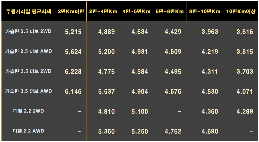 시세를 살펴보시면 주행거리가 늘어날수록 감가가 쭉쭉 빠지는 것을 알 수 있습니다.