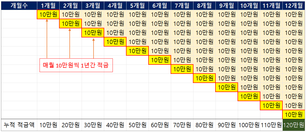 매월 10만원씩 1년동안 은행에 맡긴 후에 1년 후 찾는 방식으로 이해하시면 됩니다.