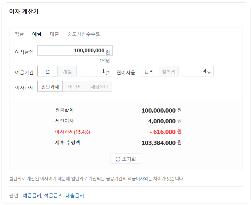 네이버에서 예금이자 계산기로 검색하면 나오는 화면입니다.