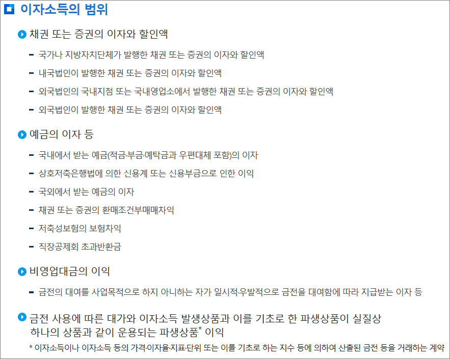 국세청>국세신고안내>개인신고안내>원천세>금융(이자·배당)소득> 이자소득의 범위 (nts.go.kr)