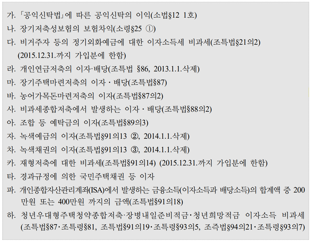 조세법과 신탁법에 의한 14가지 사항에 대해서 이자소득세가 비과세되기 때문에 잘 살펴보면 이자소득세를 절세할 수 있습니다.