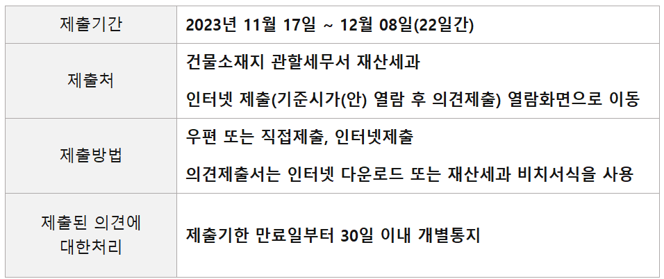 2023년 올해도 기준시가를 고시하고 의견을 청취중입니다.
