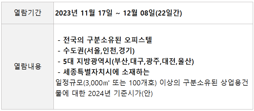 2023년 오피스텔, 상업용 건물 기준시가 사전 열람기간은 11월 17일부터 12월 8일 까지 입니다.