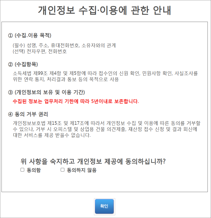 개인정보제공에 동의하시고 확인버튼을 클릭합니다.