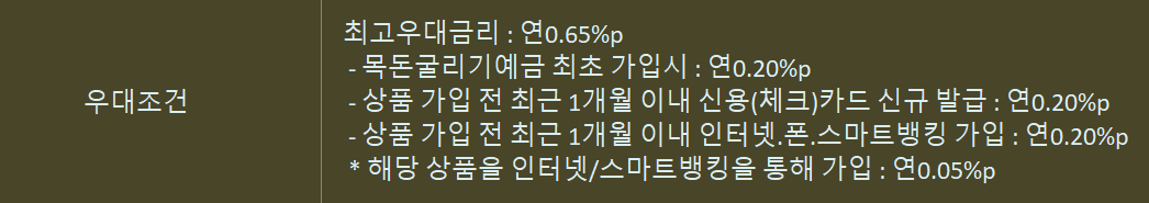 최초가입 0.2%, 체크카드 신규 발급 0.2%, 스마트뱅킹 가입 0.2%, 인터넷 가입 0.05% 가 조건별 우대금리 입니다.