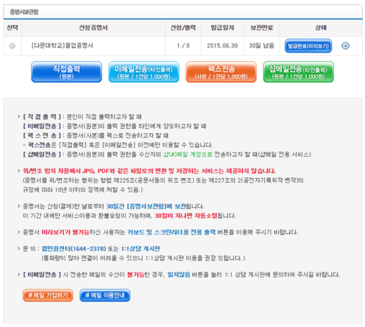 졸업증명서를 요구하는 기관에서 이메일 등으로 제출을 요구할 경우에 사용하면 됩니다.