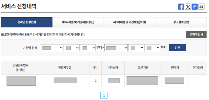 마지막으로 신청버튼을 클릭하면 민원처리현왕이 뜹니다.