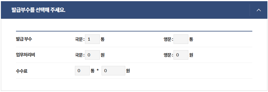 발급부수와 국문, 영문을 선택해 주세요.