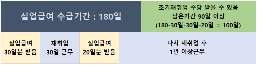 이 경우에는 실업급여 수급일 180일 중 마지막 취업했을때 실업급여 남은 기간이 50% 이상인 100일 이기 때문에 조기재취업수당을 받을 수 있습니다.