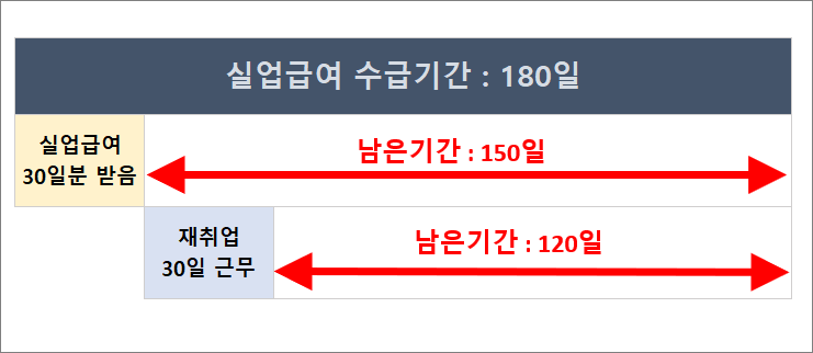 ★ 실업급여 수급기간 180 - 실업급여 받은 기간 30일 - 재취업기간 30일 = 남은 실업급여기간 120