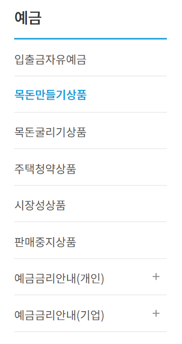 왼쪽 메뉴에서 목돈만들기상품을 선택합니다.