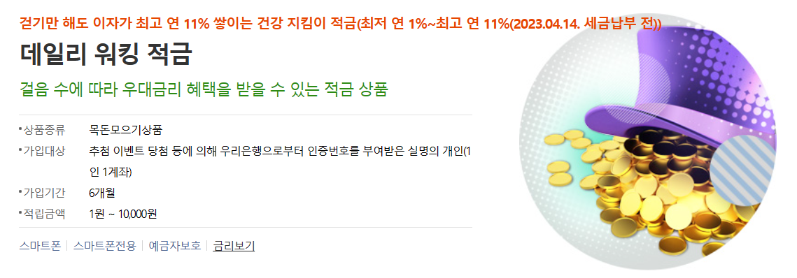 적금 이율 11.00% : 우리은행 데일리 워킹 적금
