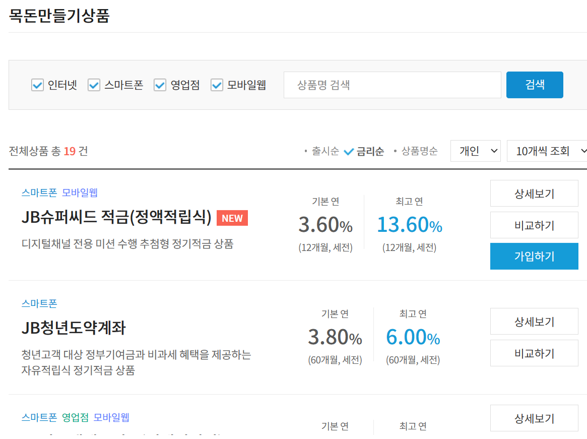 JB슈퍼시드 적금이 금리가 가장 높기 때문에 제일 위쪽에 보입니다.