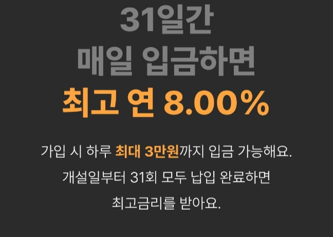하루에 최대 3만원까지 적금이 가능하니 한달이면 31일 × 3만원 = 93만원까지 적금이 가능해요.