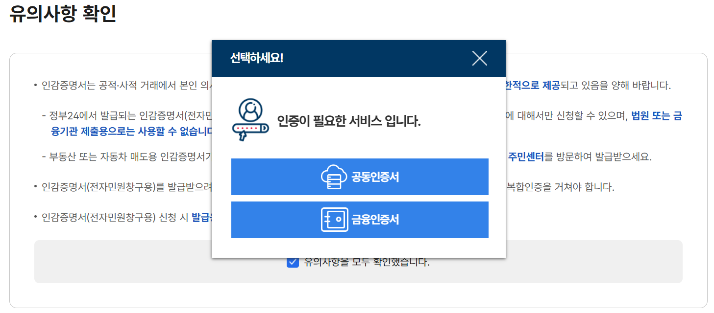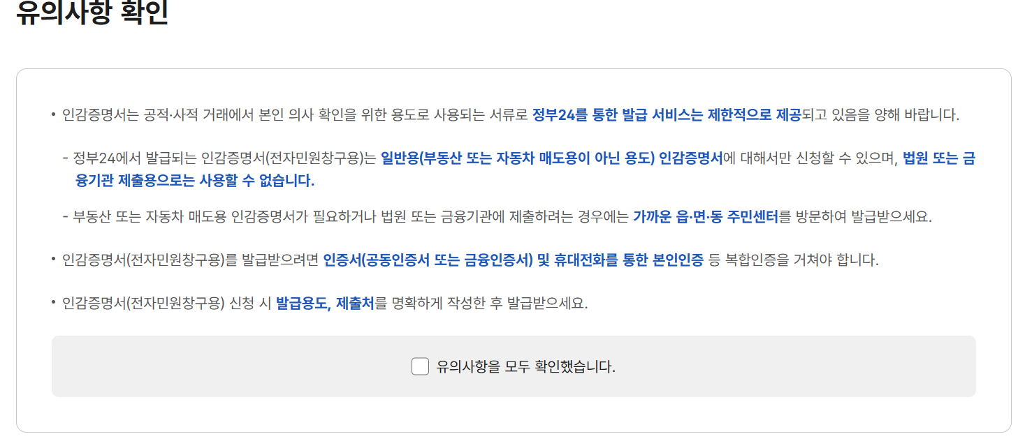 인감증명서는 중요한 문서라 첫 화면부터 유의사항을 보여줍니다.