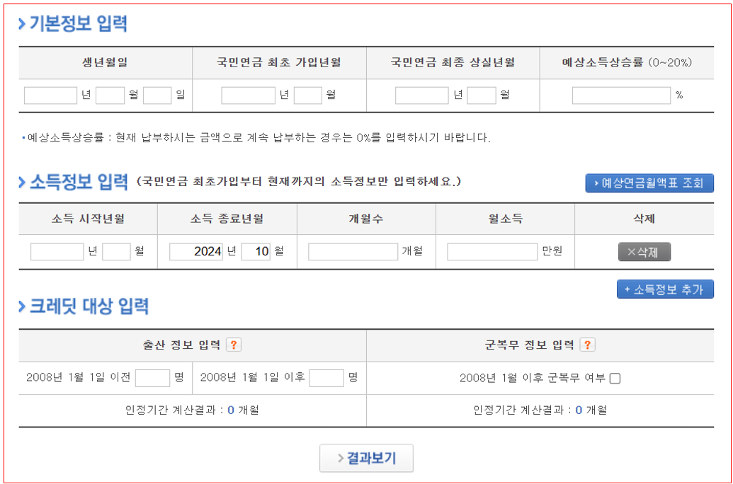 국민연금 최초 가입일과 최종 상실일, 예상소득 상승률 등을 직접 입력해야 하는 번거로움은 있습니다.