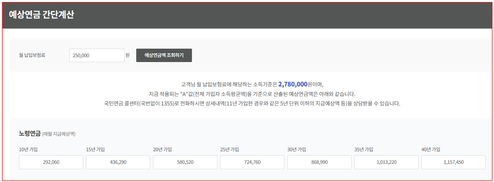 간단하게 테스트 해보면 매월 25만원을 납부한다고 하면 10년 가입했을때는 매년 292,060원을 받을 수 있고 40년을 가입하면 1,157,450원을 받을 수 있습니다.