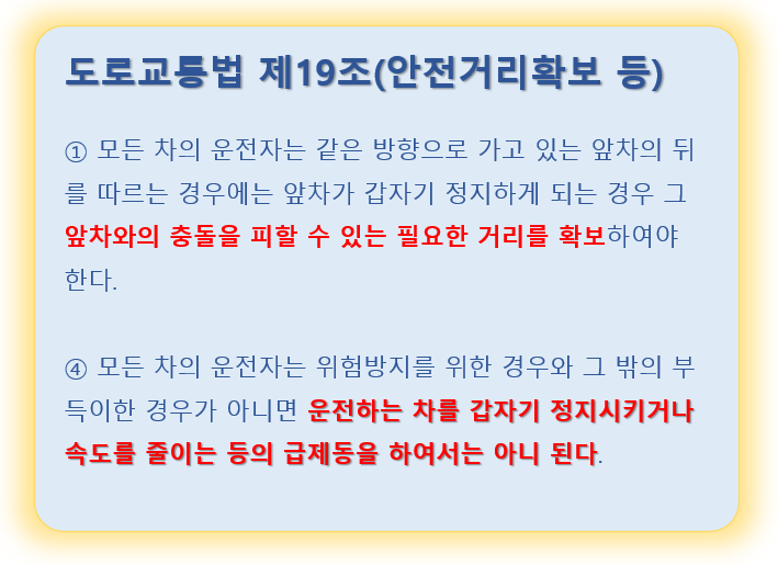 - 주택가나 상점가처럼 보행자 통행이 많은 지역에서는 급제동이 필요한 상황이 많을 수 있으며, 후행 차량(A차량)은 이를 고려하여 안전거리를 확보해야 합니다.