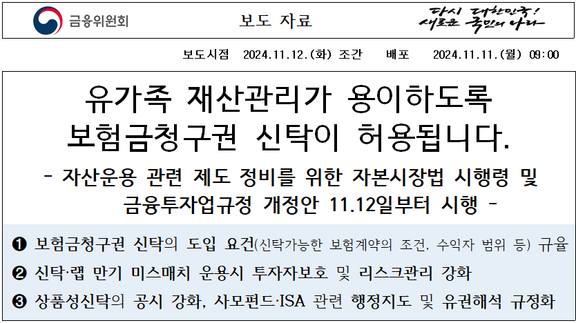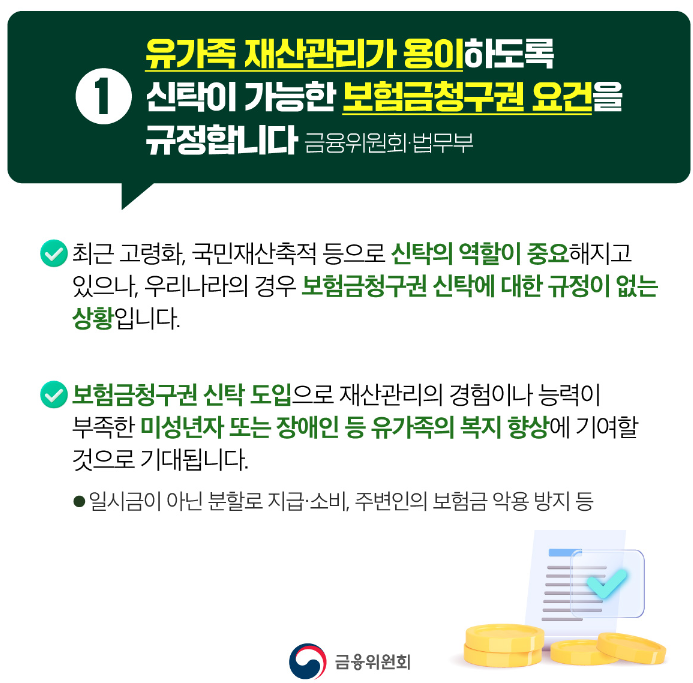 유가족 재산관리가 용이하도록보험금청구권 신탁이 허용됩니다. - 자산운용 관련 제도 정비를 위한 자본시장법 시행령 및 금융투자업규정 개정안 11.12일부터 시행 - ➊ 보험금청구권 신탁의