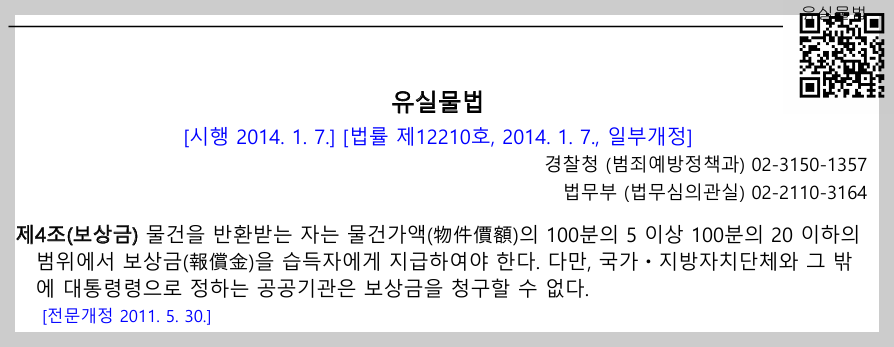 | 습득자가 경찰에 맡기고 보상금 청구함 | 경찰이 연락 시, 정당 보상금만큼 지급 요청 가능 |