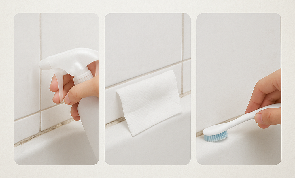곰팡이 정도가 심한 경우에는 식초를 조금 더 넣고 방치 시간을 늘리는 것도 방법입니다. 또한 타일 틈이나 실리콘 부분처럼 스며들기 쉬운 공간에는 혼합액을 뿌리고 키친타월을 덮은 뒤 약 30분 이상 방치해주면 효과가 높아집니다.