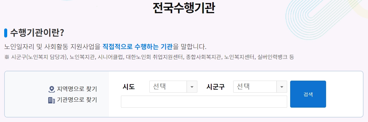 자 그럼 가장 중요것은 쉽고 편하게 내가 살고 있는 지역의 노인일자리를 검색하고 사업을 수행하는 기관을 알아보는 것이겠죠?