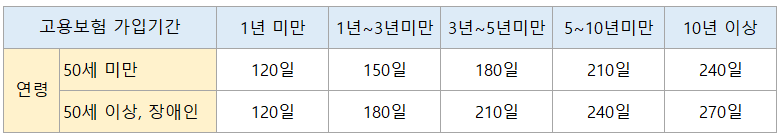 실업급여 기간은 50세 이상인지 미만인지와 장애인인지 아닌지에 따라 다르게 지급됩니다.