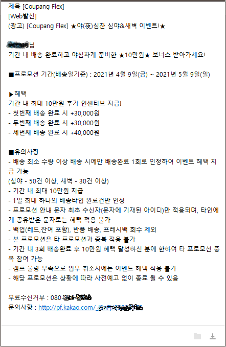 내용인 즉슨 심야배송 50건 이상이나 새벽배송 30건 이상 한번하면 3만원, 두번하면 3만원, 세번하면 4만원 해서 총 10만원을 인센티브로 준다는 이야기였습니다.